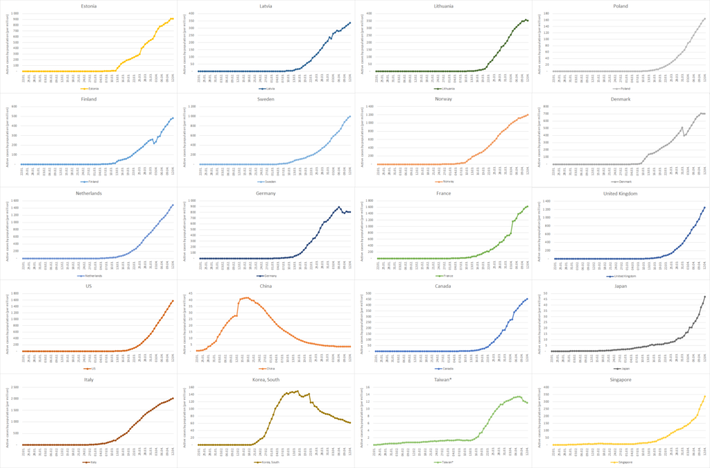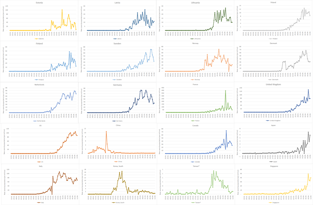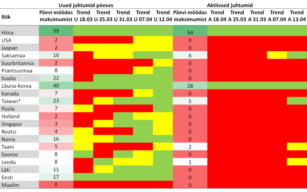 • Esimest korda pandeemia ajal on mõnes riigis hakanud haigestunute koguarv stabiliseeruma (Taani, Leedu) või koguni langema (Saksamaa, Taiwan).