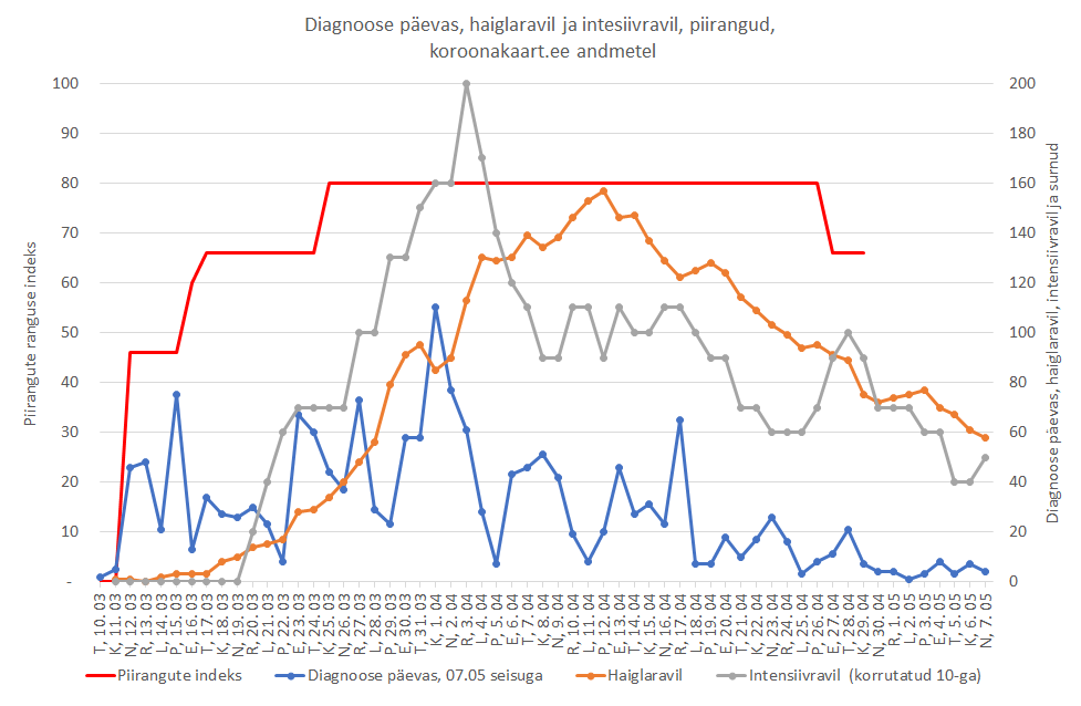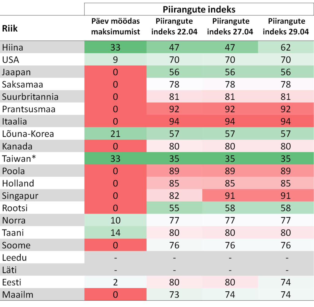 • Paljud riigid on alustanud ametlikult piirangute leevendamist. Sellel nädalal see piirangute indeksis veel ei kajastu, kuna Oxfordi ülikool uuendab indeksit üsna aeglaselt.