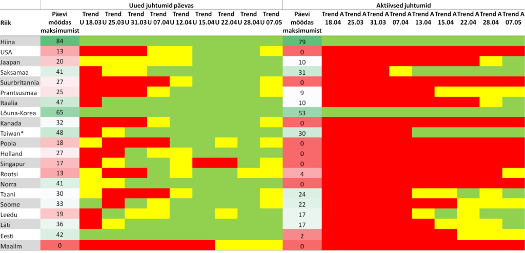 • Paljudes riikides on viimasel nädalal langustrend pidurdunud, uute juhtumite arv stabiilne. See võib olla tingitud piirangute järgimise vähenemisega, inimesed on frustreeritud ja piirangutest tüdinud.