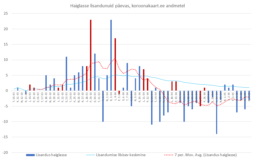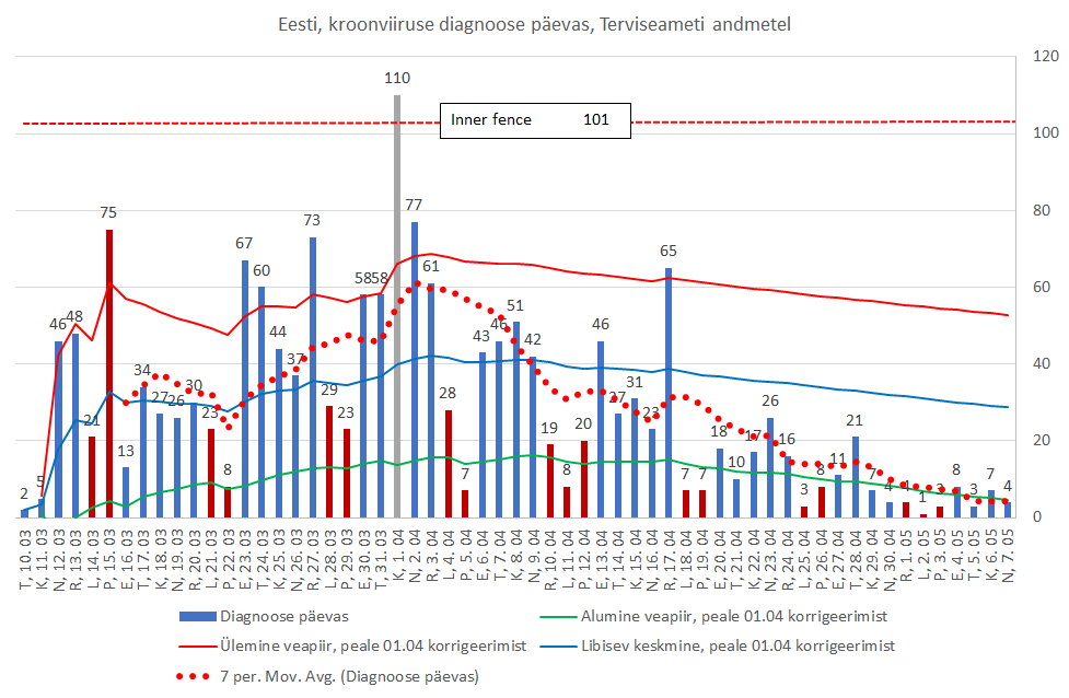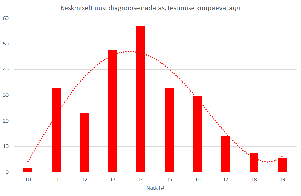 • Naabrite ja partnerite juures on märgata trendi nädalasisest sesoonsust – nädalavahetustel on diagnooside arv väike, nädala alguses kasv, nädala lõpus langus. Üldine trend on jätkuvalt langev, tempo ühtlane.