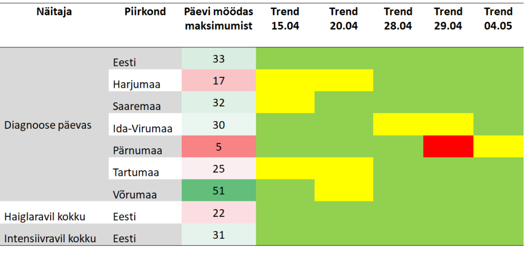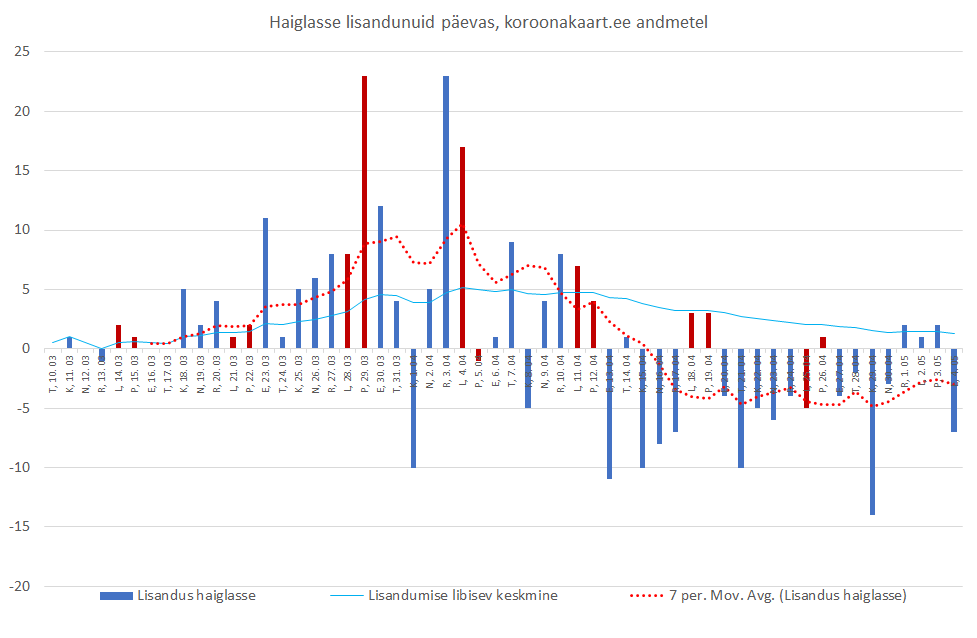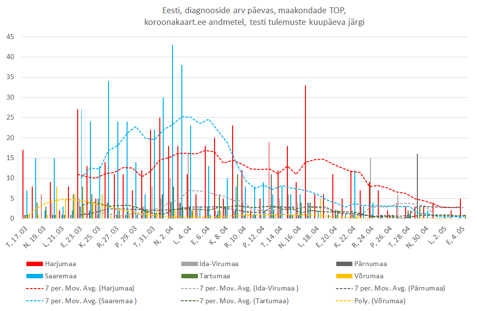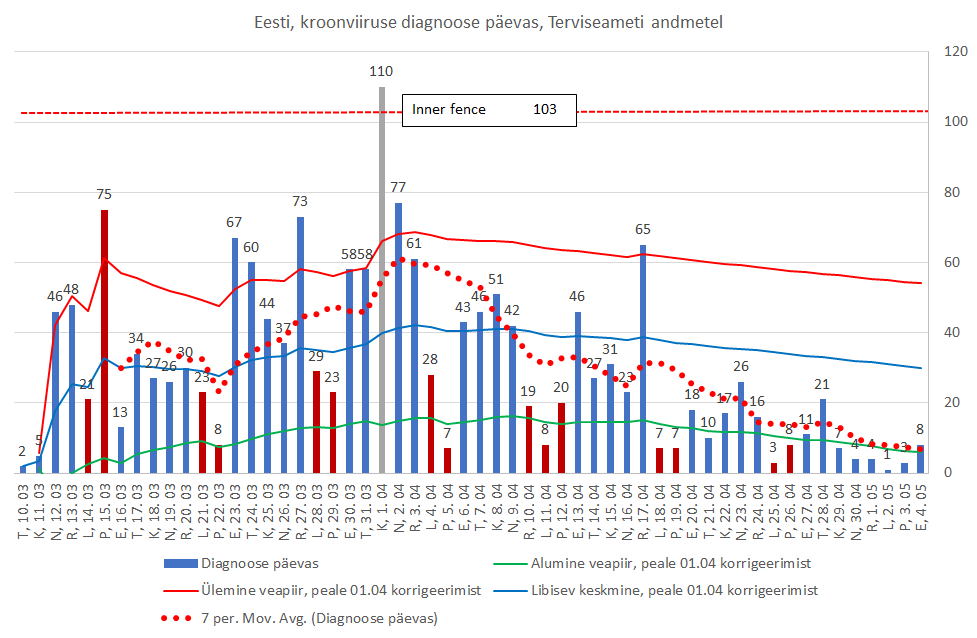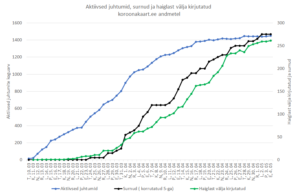 Igatahes tiksub uute diagnooside arv 5 ja 10 vahel päevas ja jääb sinna tiksuma mõneks ajaks, nagu teame näiteks Lõuna-Korea kogemusest. Piirangute leevendamise järel tuleb olla valmis haigestumiste arvu kasvuks, kuid sellest pääsu pole. Varem või hiljem puutub igaüks meist viirusega kokku. Enamus meist ei saa sellest arugi, põeb läbi ilma, et midagi tunneks.