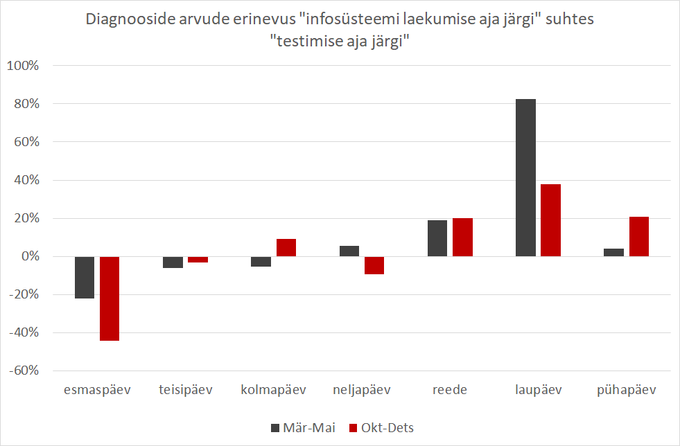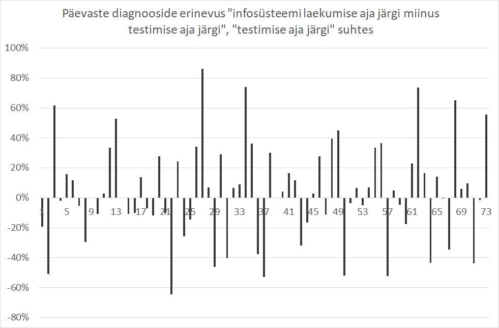 Vaatasin kõigepealt, milline on pilt päevade lõikes. Absoluutarvudes erinevused pidevalt suurenevad, kord on diagnoose rohkem, kord jälle vähem. Kehvematel päevadel on vahed sadades diagnoosides.